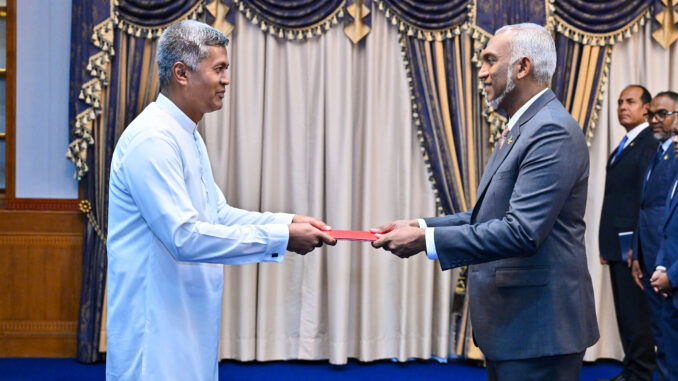 ސްރީލަންކާ ސަރުކާރުން ދިވެހިރާއްޖެއަށް ކަނޑައެޅުއްވި އައު ސަފީރު، ހިޒް އެކްސަލަންސީ މުޙައްމަދު ރިޒްވީ ޙަސަން، ރައީސުލްޖުމްހޫރިއްޔާ ޑޮކްޓަރ މުޙައްމަދު މުޢިއްޒުއަށް، ސަފީރުކަމުގެ ފަތްކޮޅު އަރުވައިފިއެވެ. ސްރީލަންކާ ސަރުކާރުން ދިވެހިރާއްޖެއަށް ކަނޑައެޅުއްވި އައު ސަފީރު، ސަފީރުކަމުގެ ފަތްކޮޅު އަރުވާފައިވަނީ، އެކަމަށްޓަކައި މިއަދު މެންދުރު، ރައީސުލްޖުމްހޫރިއްޔާގެ އޮފީހުގައި ބޭއްވެވި ޚާއްޞަ ރަސްމިއްޔާތެއްގައެވެ.