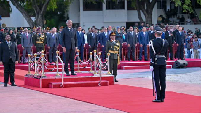 ދިވެހިރާއްޖޭގެ ނަޞްރުގެ ދުވަހުގެ މުނާސަބާ ފާހަގަ ކުރުމަށް، ދިވެހި ޤައުމީ ދިފާޢީ ބާރު، އެމް.އެން.ޑީ.އެފުން ޖުމްހޫރީ މައިދާނުގައި މިއަދު ކުރިއަށް ގެންދިޔަ ސިފައިންގެ އަސްކަރީ ހުށަހެޅުމުގެ ޙަރަކާތް، ދިވެހިރާއްޖޭގެ ރައީސުލްޖުމްހޫރިއްޔާ އަދި ސިފައިންގެ އެންމެ މަތީވެރިޔާ ޑޮކްޓަރ މުޙައްމަދު މުޢިއްޒުއާއި އެމަނިކުފާނުގެ އަނބިކަނބަލުން ސާޖިދާ މުޙައްމަދު ބައްލަވާލައްވައިފިއެވެ.