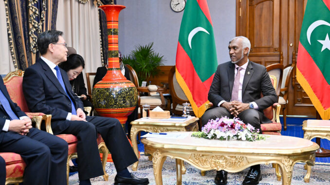 ޗައިނާގެ ނޭޝަނަލް ޕީޕަލްސް ކޮންގްރެސްގެ 14 ވަނަ ސްޓޭންޑިންގ ކޮމިޓީގެ ވައިސް ޗެއަރމަން، މިސްޓަރ ވޮންގް ޑޮންގްމިން، ރައީސުލްޖުމްހޫރިއްޔާ ޑޮކްޓަރ މުޙައްމަދު މުޢިއްޒުގެ އަރިހަށް އިޙްތިރާމުގެ ޒިޔާރަތެއް ކުރައްވައިފިއެވެ. މި ބައްދަލުކުރެއްވުން އޮތީ، މިއަދު ހެނދުނު ރައީސުލްޖުމްހޫރިއްޔާގެ އޮފީހުގައެވެ.