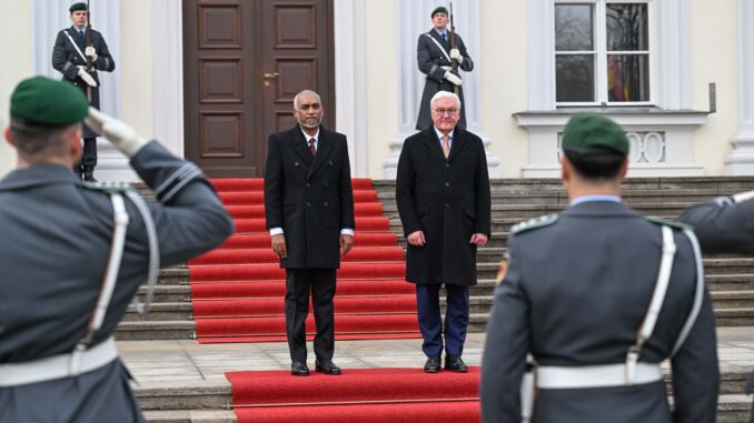 ޖަރުމަނުވިލާތުގެ ރައީސް ފްރޭންކް-ވޯލްޓަރ ޝްޓައިންމަޔަރގެ ދަޢުވަތަކަށް ރައީސުލްޖުމްހޫރިއްޔާ ޑޮކްޓަރ މުޙައްމަދު މުޢިއްޒު، މިހާރު އެގައުމަށް ކުރައްވާ ދަތުރުފުޅުގައި، އެމަނިކުފާނަށާއި އެމަނިކުފާނުގެ ވަފުދަށް ރަސްމީގޮތުން މަރުޙަބާ ދަންނަވައިފިއެވެ.