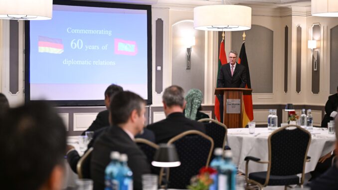 ދިވެހިރާއްޖެއާއި ޖަރުމަނުވިލާތާ ދެމެދު ޚާރިޖީ ގުޅުން ގާއިމުކުރިތާ 60 އަހަރު ފުރުން ފާހަގަކުރުމަށް ޖަރުމަނުވިލާތުގެ ބަރލިންގައި ބޭއްވި ރަސްމީ ޖާފަތުގައި ރައީސުލްޖުމްހޫރިއްޔާ ޑޮކްޓަރ މުޙައްމަދު މުޢިއްޒު ބައިވެރިވެވަޑައިގެންފިއެވެ.